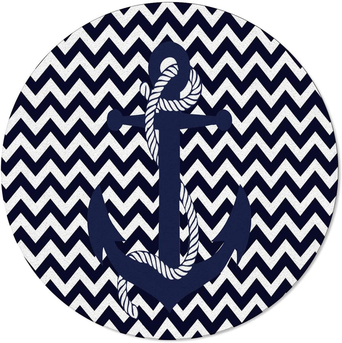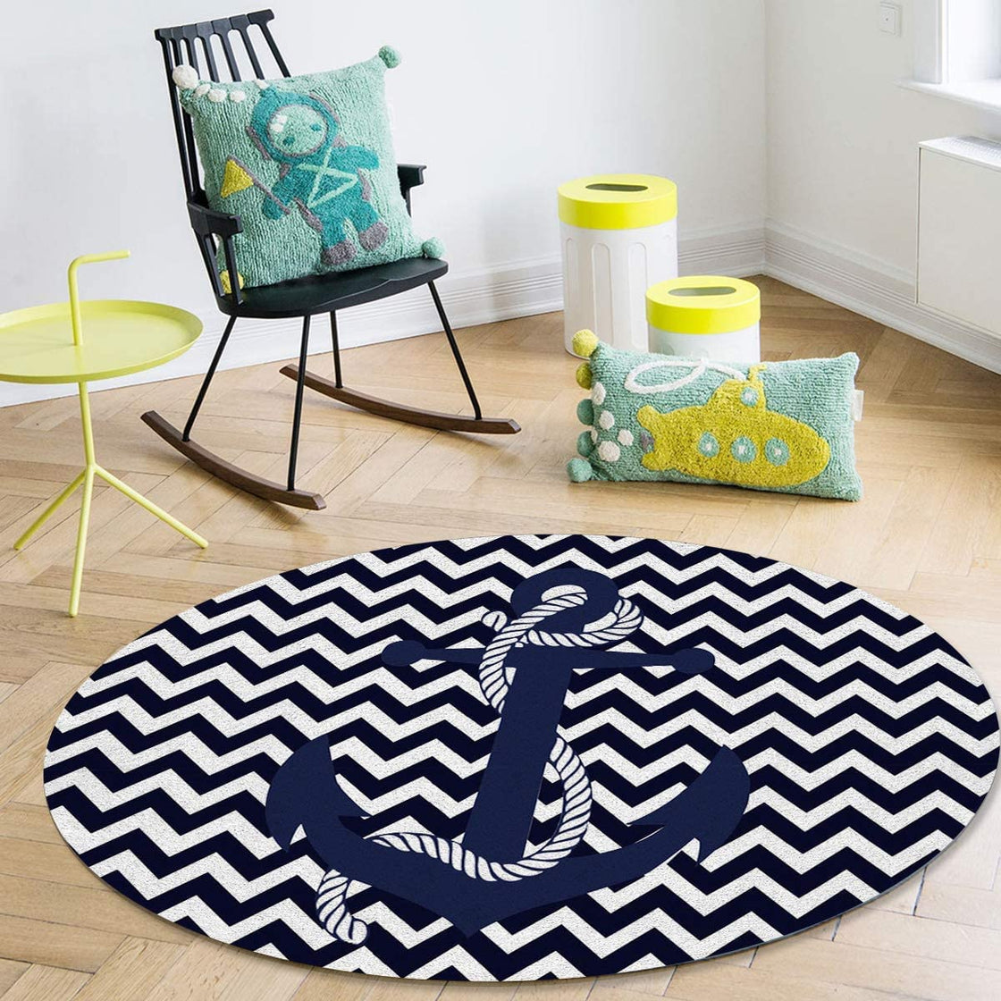 Navy Blue Nautical Anchor Round Rug – Hand Tufted Chevron Carpet for Coastal Decor